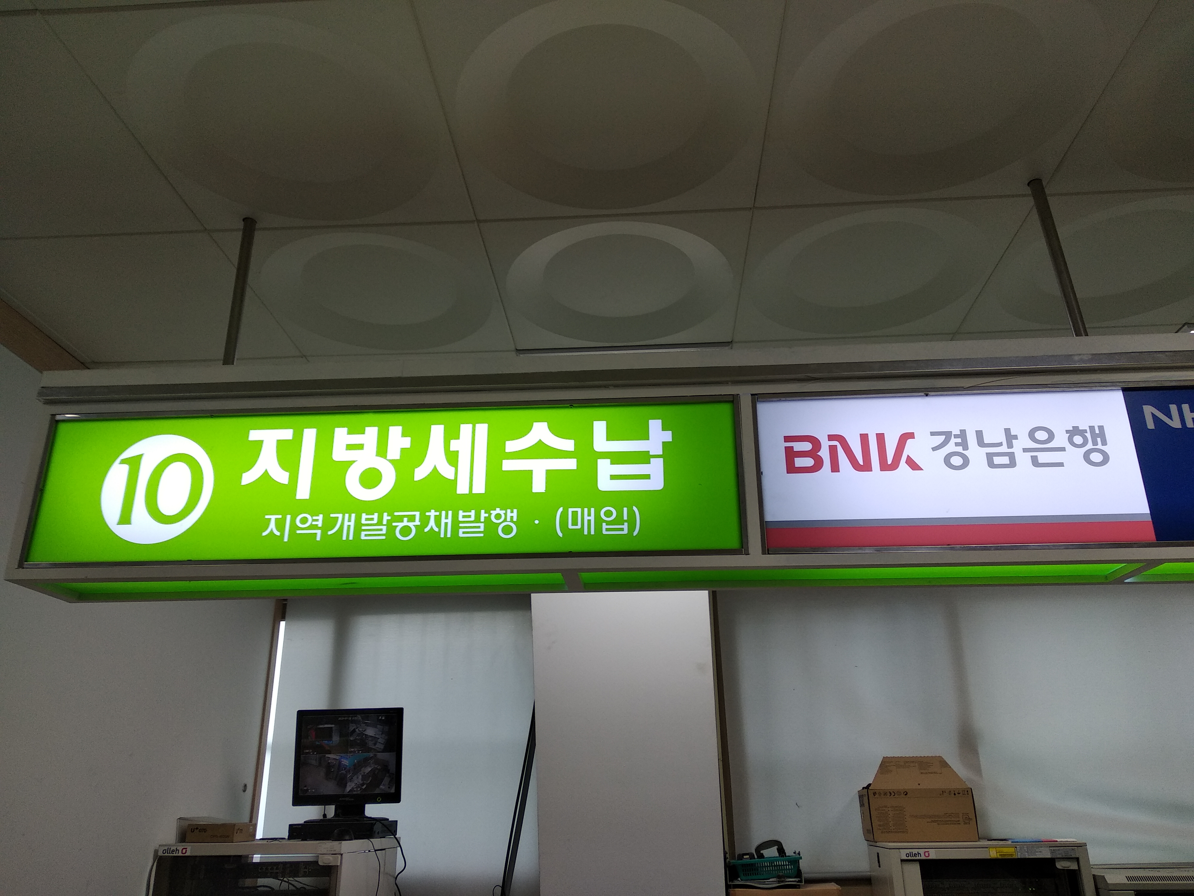 입구에 경남은행과 농협이 있습니다. 필요한 현금은 지방세와 수수료 총 4,000원입니다. 취등록세는 카드로 내셔도 됩니다. 우선 들어가서 오른쪽에 지방세 내는 곳에 1,000원을 내고 수입증지를 받습니다.
