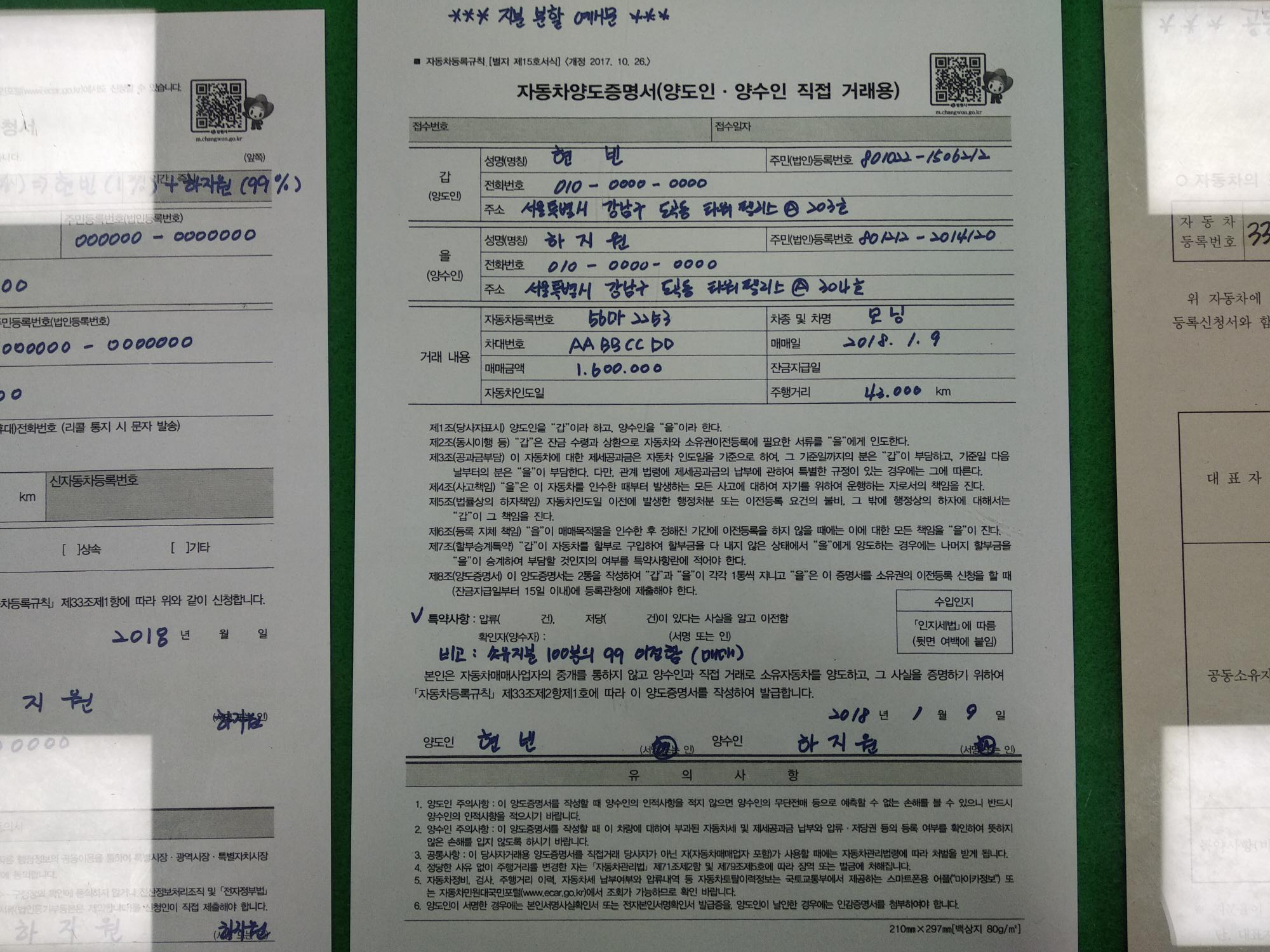우선 양도인 양수인 쌍방이 같이 가게 되면 신분증과 자동차등록증만 있으면 됩니다. 지분이 있으신 분들은 다 같이 가셔야 합니다. 혹시 대리인이 참석하게 되면 아래의 사이트에서 서류 참고하시면 됩니다.