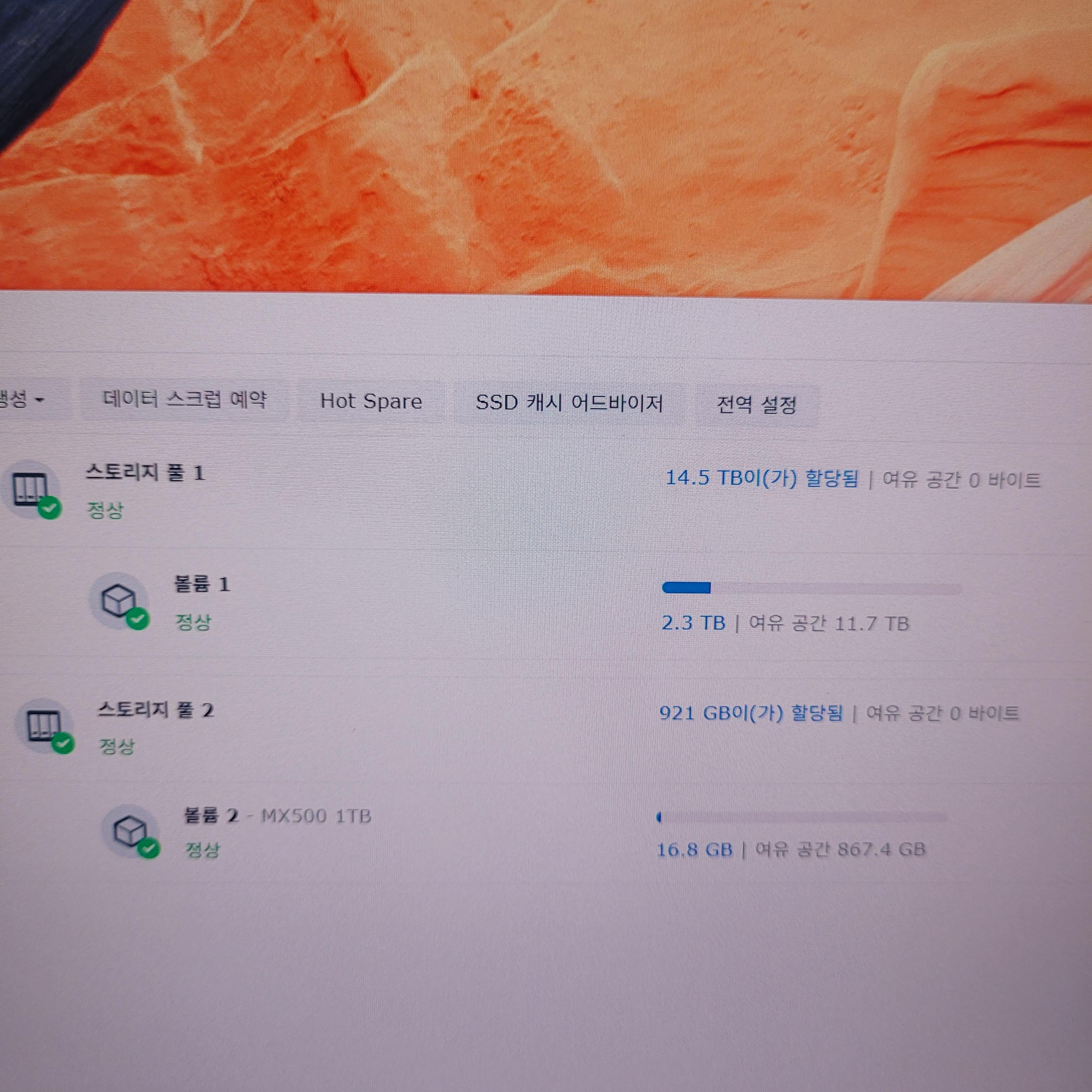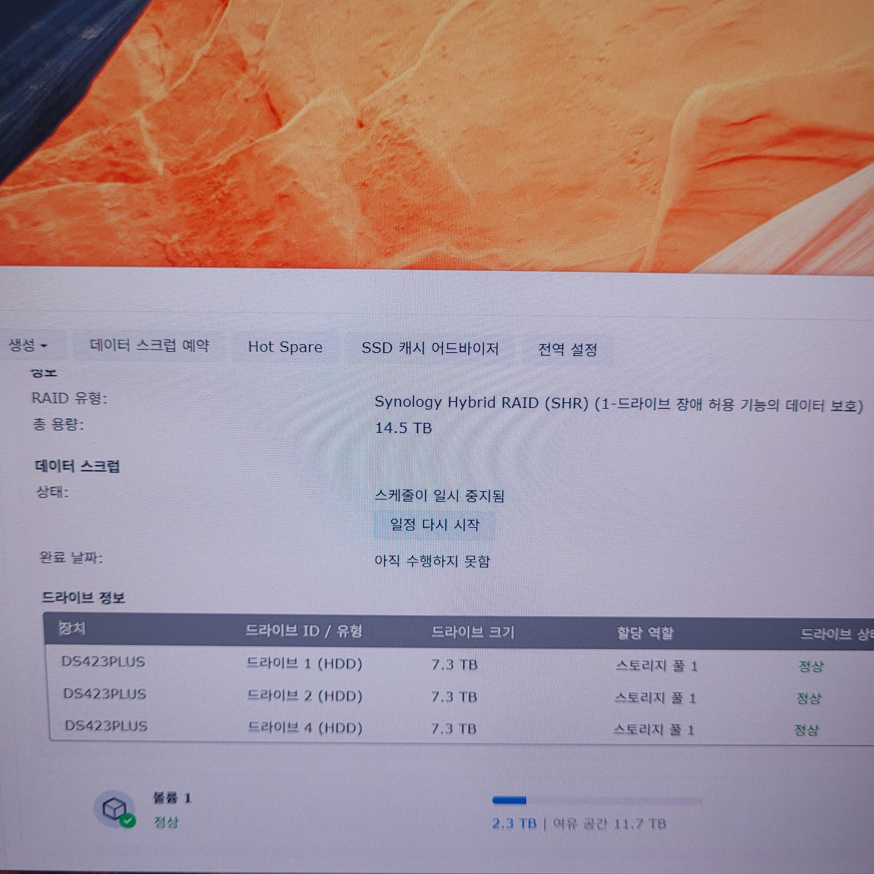 시놀로지 DS423+를 사용하고 있습니다. SHR로 레이드를 구성하고 있는데, 8+8+4TB SHR로 묶어서 10.9TB를 쓰다가 8TB 14만원에 나왔길래 샀습니다. 8+8+8TB로 구성하니 14.5TB가 되었습니다. 과정은 간단했으나, 시간은 53시간 50분 정도 걸렸네요.