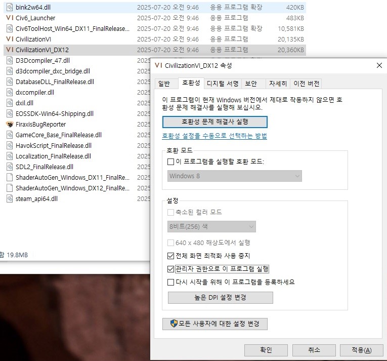 2. CivilizationVI_DX12 오른쪽 클릭 - 속성 - 호환성 - 전체화면 최적화 사용 중지 체크, 관리자 권한으로 이 프로그램 실행 체크 - 적용